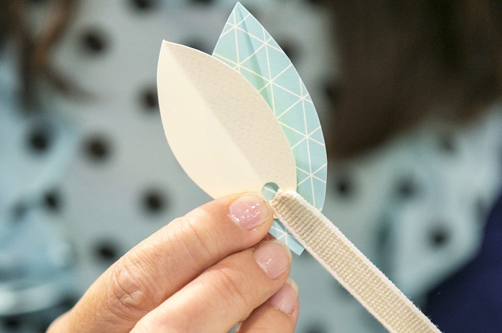 - Piega a metà un rettangolo di cartoncino, disegna lungo la piega metà sagoma di foglia e ritagliala.