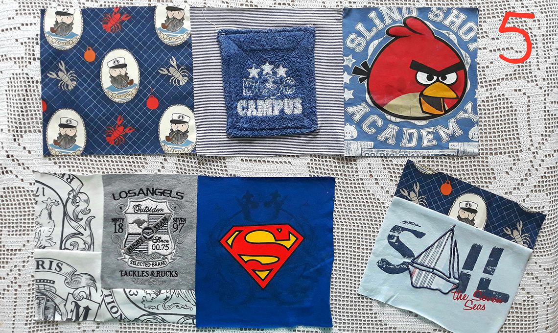 - Crea i quadrati di stoffa che compongono il cuscino: posiziona sul tavolo i capi selezionati, già tagliati e privati delle parti che pensi di non utilizzare. Ritaglia dal cartoncino un quadrato di cm 20x20 e usalo per riportare la forma sul retro dei vestitini scelti ricavando 6 quadrati di stoffa. Se i pezzi di stoffa sono più piccoli puoi fare una giunta e rifinirla con un nastro o passamaneria in contrasto.