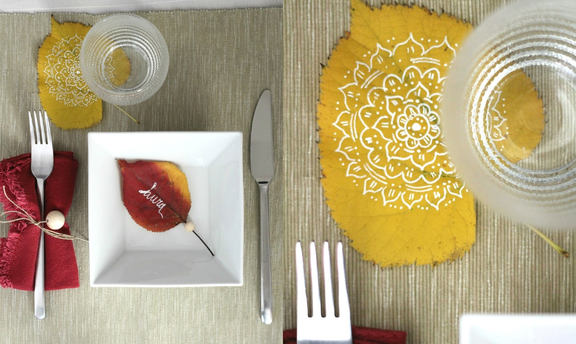 L’idea in più: con le foglie pressate e disegnate puoi personalizzare e regalare poesia anche alla mise en place della tua tavola! Posiziona le foglie sotto ai bicchieri oppure usale come segnaposto, scrivendoci sopra il nome dei tuoi ospiti e decorandole con una perlina di legno naturale infilata nel picciolo.