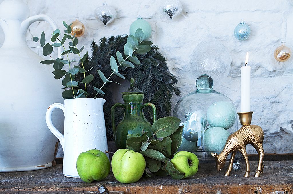 Una ghirlanda verde, rametti in una caraffa e alcune mele. Un décor semplice, che sa di casa. Basta un filo di lucine e tante palline appese e l’atmosfera è pronta!