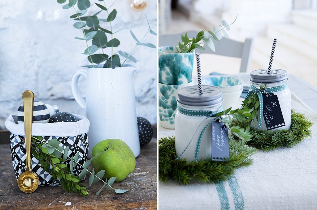 Sacchettino grafico [Serax], clip oro [JV Store], palline [Cargo High Tech]. A destra Tessuto vintage [All’Origine], barattoli Mason Jar, etichette lavagna e cannucce [decochic.it], ghirlande di pino [Enzo De Gasperi].