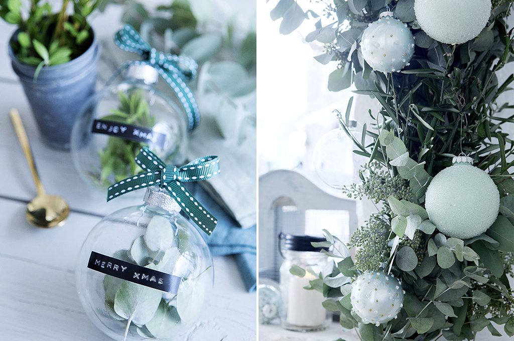 Inserisci nelle classiche boules di vetro dei rametti o piccole composizioni verdi e con la dymo scrivi il tuo messaggio d’auguri. Palline [Enzo De Gasperi], barattolo portacandela [decochic.it], gabbietta [Antonello di Lauro].