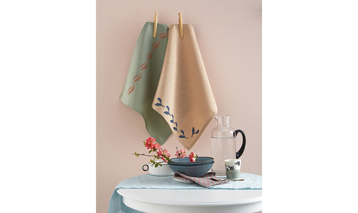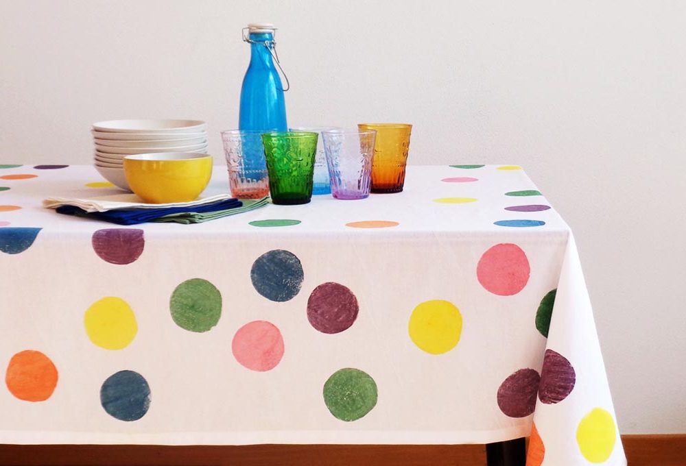 in vetro [Zara Home]. bicchiere in ceramica [GioveLab], tovagliolo a pois [Society], tessuto di lino [C&C Milano].