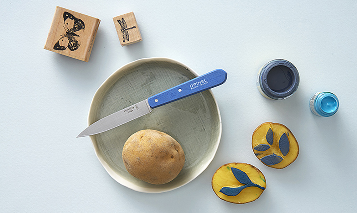 Con un pennarello all’acqua a punta fine disegna il timbro sulla patata tagliata a metà. Con un coltello spelucchino intaglia il decoro, incidendo la polpa per circa 2 cm. Rifila i contorni con un cutter e tampona l’acqua prodotta dal taglio della polpa. In un piattino, stempera il colore con un pennello piatto e stendilo sulla patata. Timbra il tessuto lavato e stirato, esercitando una pressione media per alcuni secondi.
