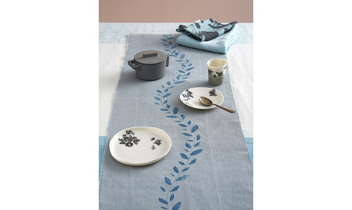 Tessuto di lino a righe [C&C Milano]. tovagliolo di cotone in ramié stampato [Society]. piattini e bicchiere Black Flora [Giovelab], posata [Zara Home], mini casseruola Terra.cotto [Sambonet].