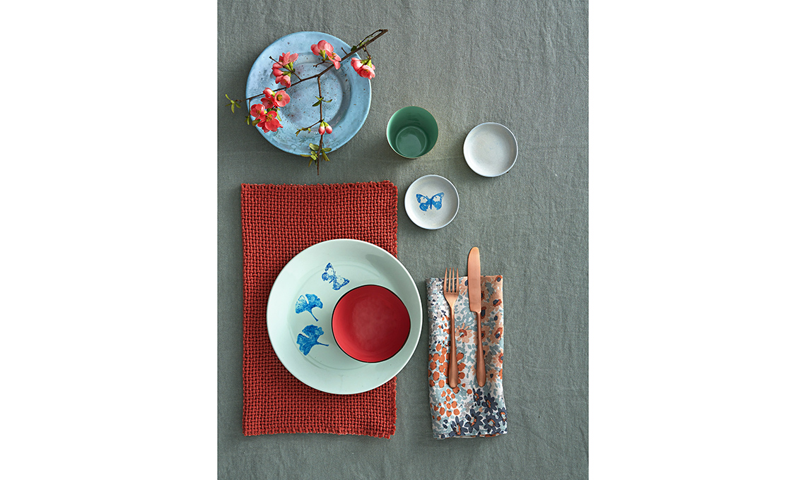 Tovaglia, americana Cable e tovagliolo di cotone in ramié stampato [Society]. Posate in rame, ciotola di cocco laccata, bicchiere in ottone laccato verde e piatto verde celadon [Untitled Homeware Milano].