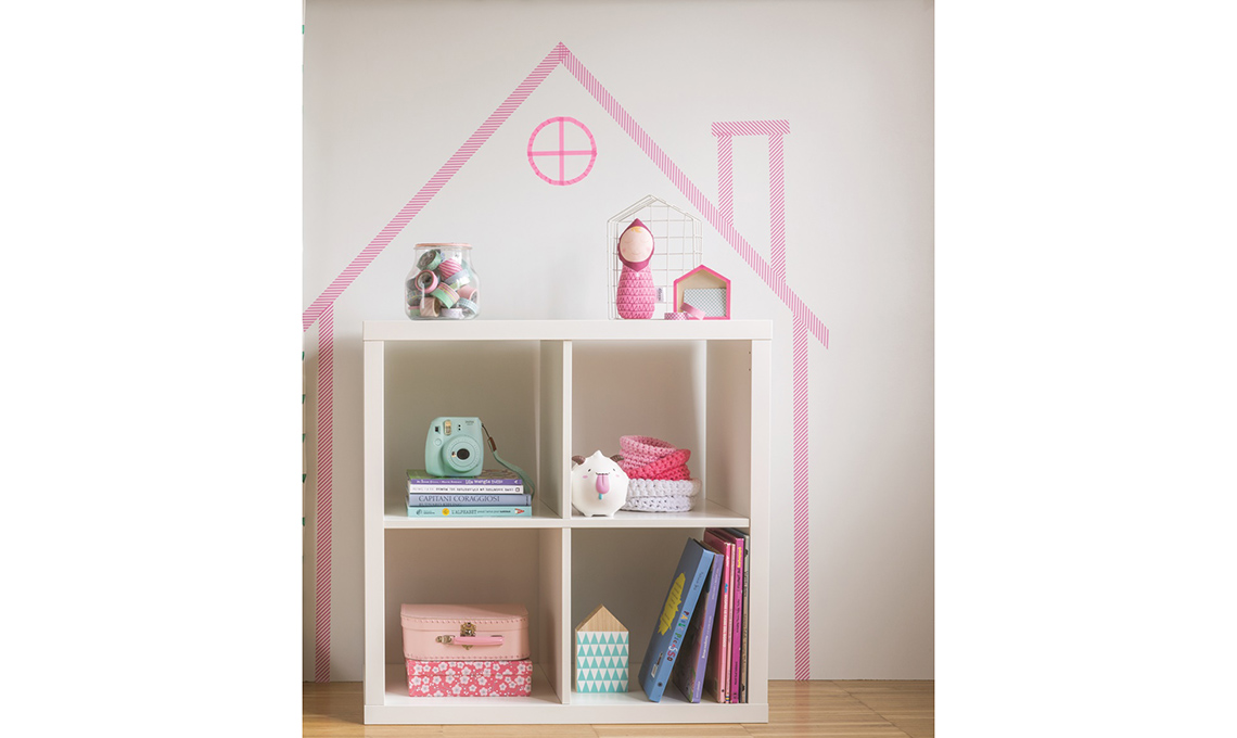 - Posiziona il Kallax nel luogo della stanza che preferisci e delinea attorno col washi tape la cassetta. Vedrete che è molto semplice, basta utilizzare lo scaffale come linea guida. E sono certa che la vostra creatività farà il resto.