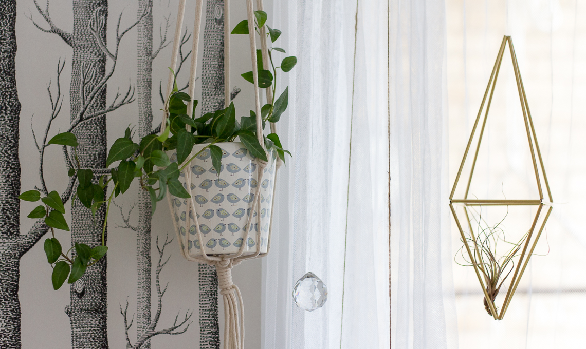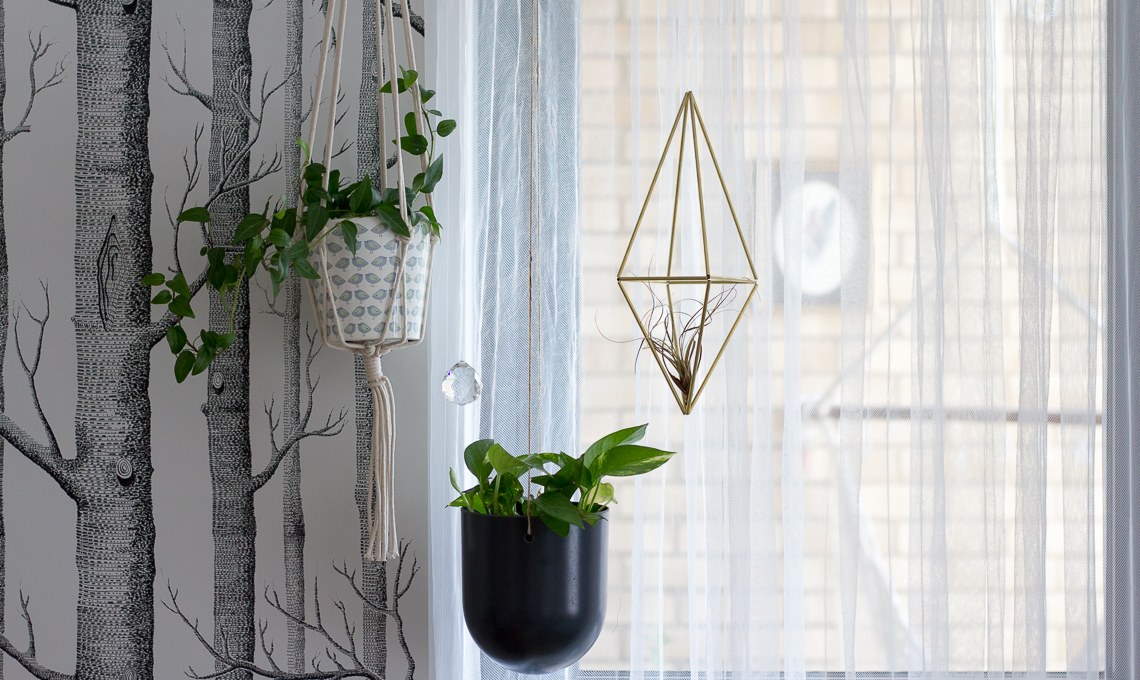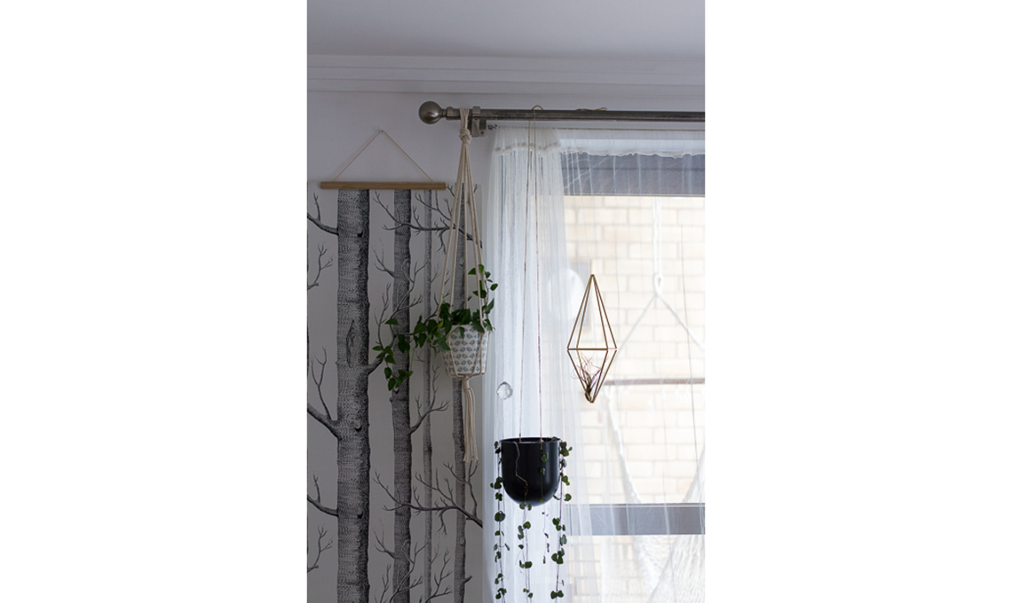 Se non vuoi fissare molti ganci al soffitto, la soluzione è quella di attrezzarti con un bastone da tenda, abbastanza solido per reggere il peso delle tue piante. Un unico elemento, nello stile della tua casa, dove poter far scendere i vasi, le ampolle ma anche elementi decorativi o stagionali in modo ordinato.