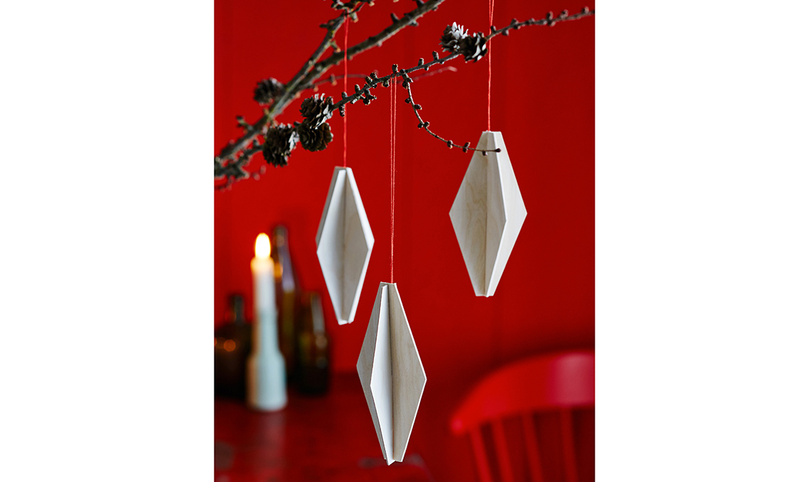 Si ispirano alle gocce di vetro sfaccettate degli chandelier di una volta gli addobbi per gli amanti del bricolage. Il materiale protagonista è il compensato sottile da modellismo dello spessore di 2 mm, lasciato al naturale.