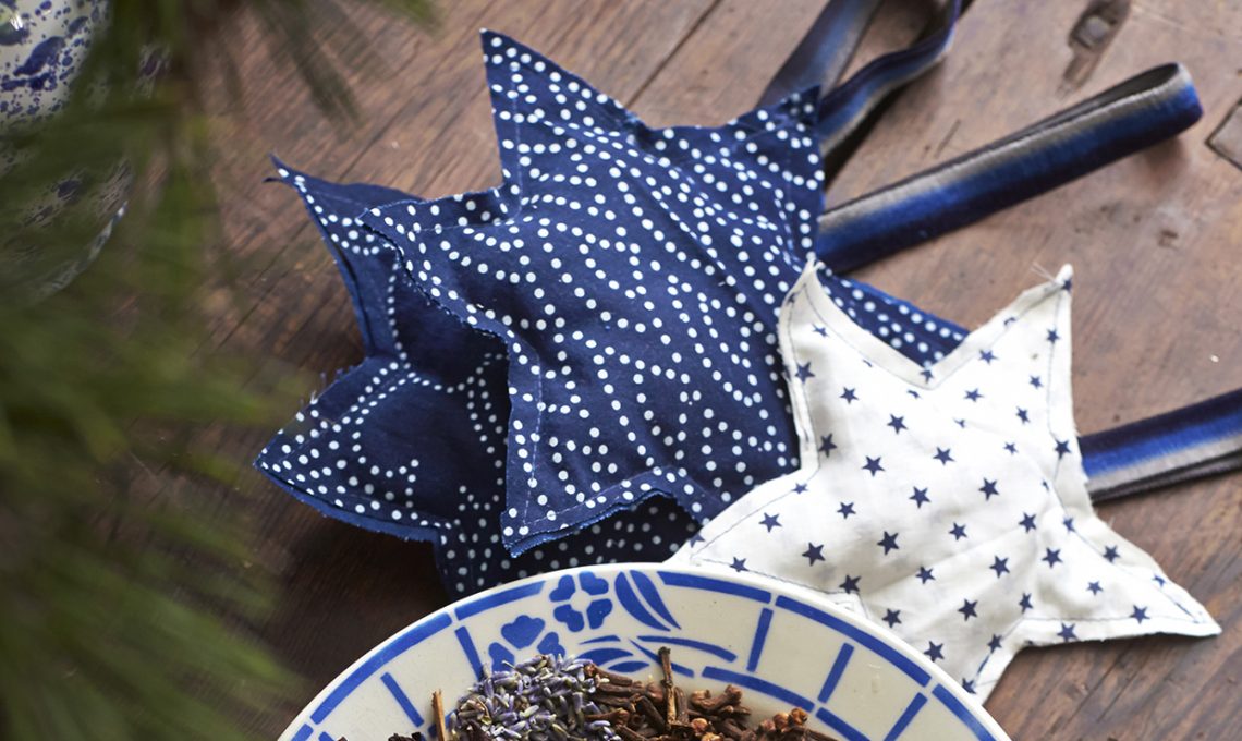 Avanzi di tessuti di cotone fantasia in bianco e blu, penna delebile per il tessuto, forbici, macchina per cucire, filo da cucito bianco o blu, pot-pourri natalizio o imbottitura, nastrino