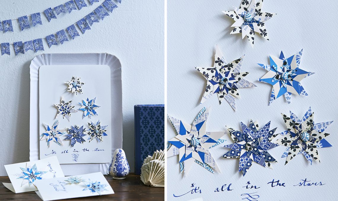 Sovrapponi stelle di carta di diverse dimensioni, sfalsa le punte e fissale al centro con un bottoncino rivestito. Il tocco chic? Gli auguri scritti a mano, in bella calligrafia.