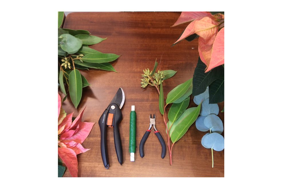 Ghirlanda priva di decorazioni, cesoie, filo di ferro e tronchese