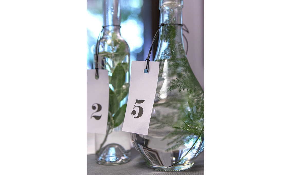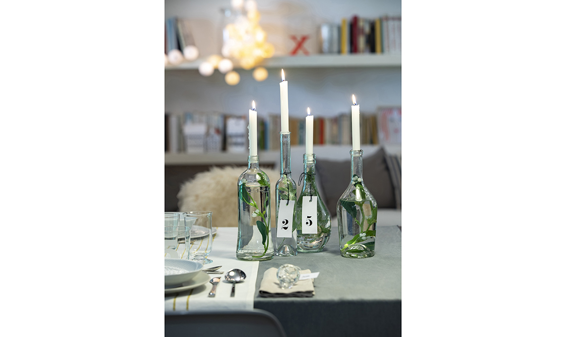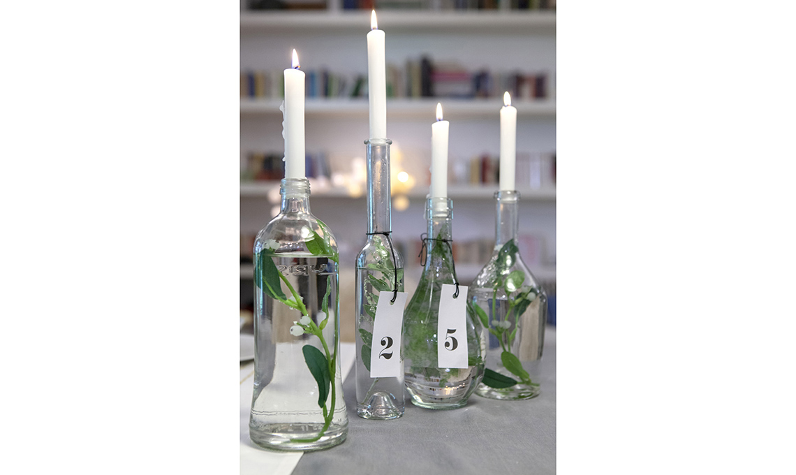 Per questo Natale, puoi creare delle decorazioni con bottiglie di vetro, candele, rami e bacche. Procurati dei rami di eucalipto, vischio o biancospino. Recupera delle bottiglie in vetro trasparente, riempile d’acqua e, aiutandoti con una pinza, inserisci i rami all'interno. Aggiungi le candele e il tocco décor delle etichette.