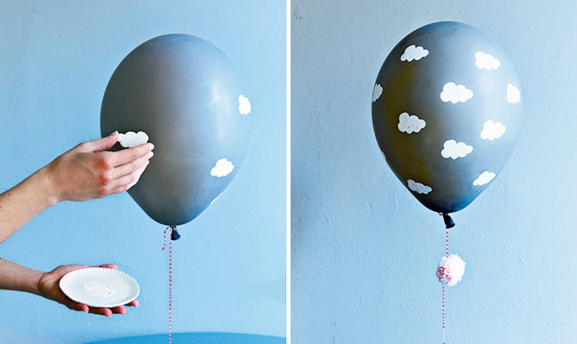 • Con le nuvole: ritaglia dal feltro una nuvoletta, imbevila nell’acrilico bianco e usala come timbro per decorare un palloncino grigio gonfiato. Lascia asciugare e con l’ago da lana infila i pompon nel cordoncino colorato.