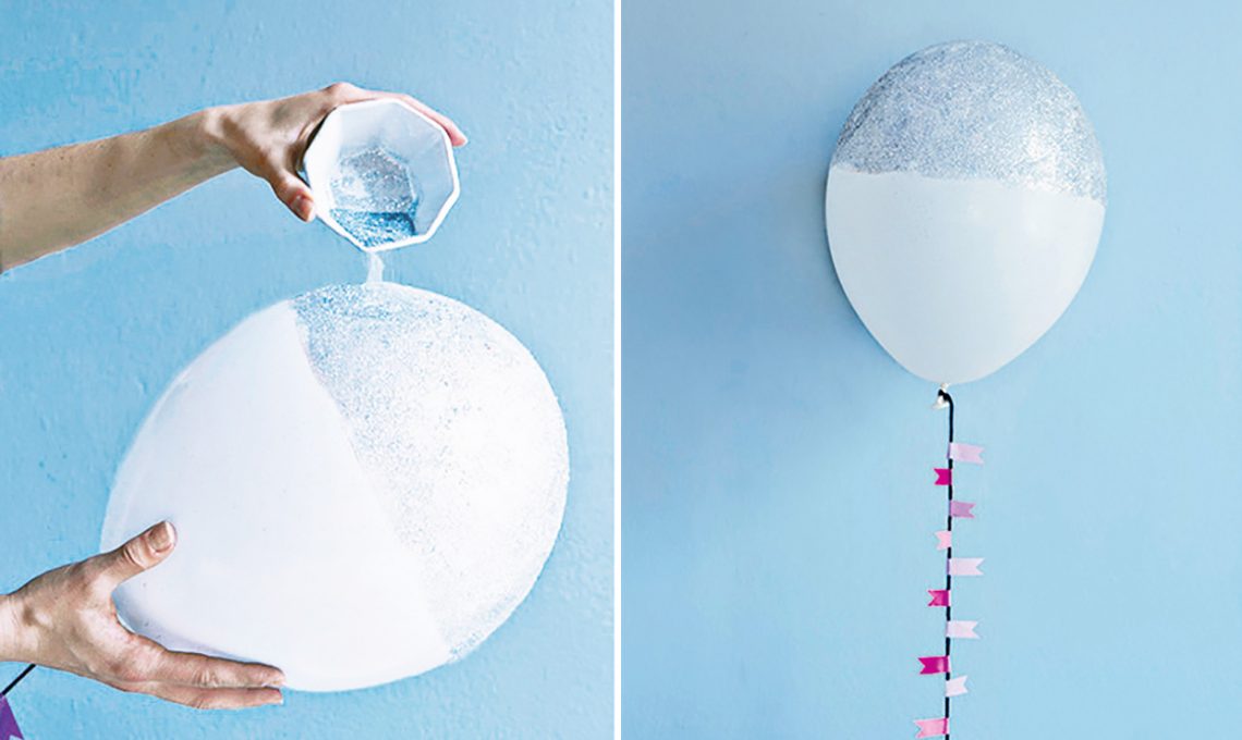• Bicolore: stendi sulla parte superiore del palloncino gonfiato una velatura di colla vinilica e spolvera sopra i glitter. Decora il cordoncino con bandierine colorate realizzate con i washi tape.