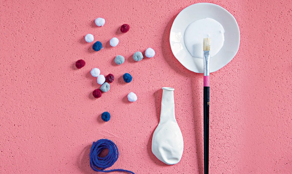 • A pois: dopo aver gonfiato un palloncino rosa con la bombola a elio, legalo con il cordoncino blu. Con una goccia di colla vinilica fissa in modo casuale i pompon, alternando tra loro i colori.