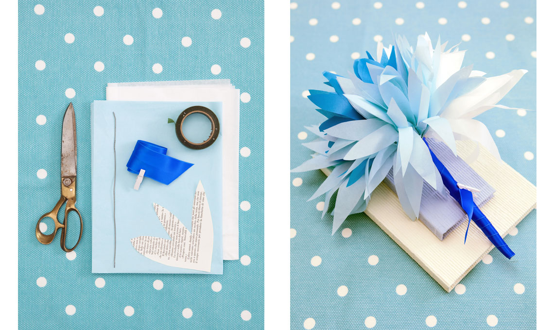- Puoi usare anche tessuti e carte di recupero al posto della carta velina, giocando con effetti di morbidezza e colore diversi e riciclando elementi che già possiedi. Il risultato sarà ancora più unico ed ecologico. In alternativa si può usare la carta crespa per realizzare altri tipi di fiori.