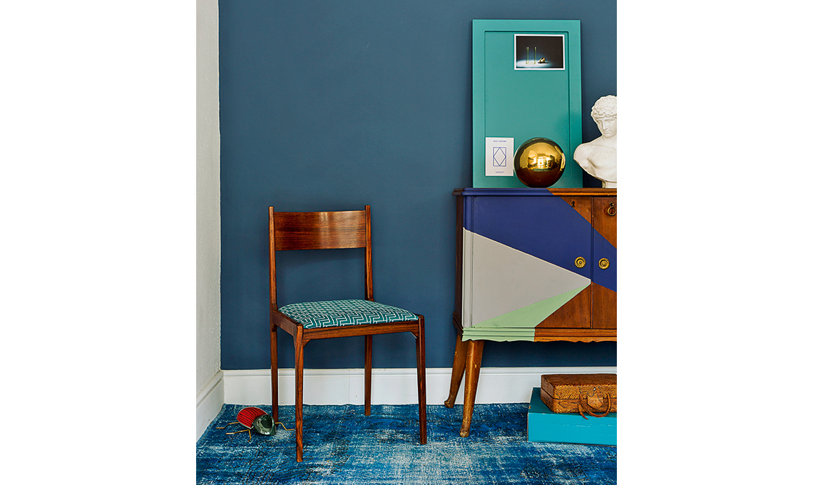 La scelta del tessuto, i pattern, gli oggetti e la palette colori: tutto deve essere calibrato e abbinato con stile per evitare l’effetto ‘pezzo-vecchio’. Il match perfetto con la madia decorata? La sedia Anni ’50 svecchiata rivestendo la seduta con un tessuto con geometrie in blu petrolio [Quiz di Nobilis, Atelier Saint Germain, da Nap Atelier].