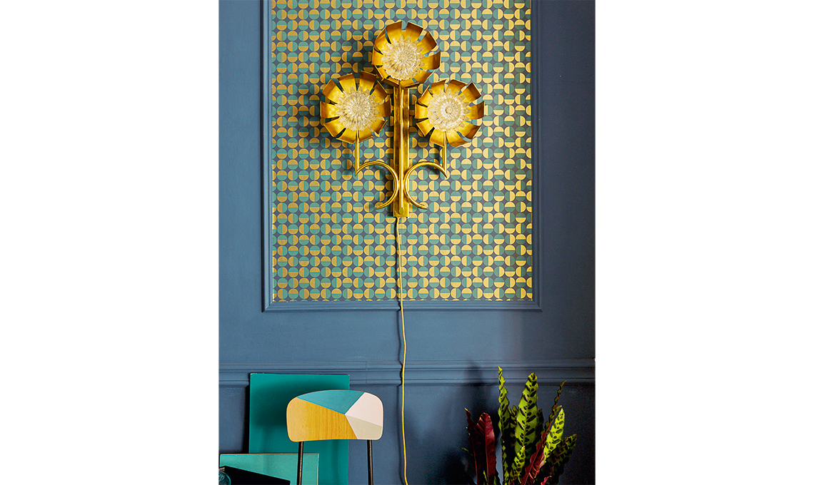 È quasi un gioiello l’applique Anni ’40 floreale. Il suo mood déco fa coppia con la wallpaper ’Vertigo’ a bolli oro e smeraldo disegnata da Arne Jacobsen [collez. Scandinavian Designers II di BoråsTapeter, da Nap Atelier].