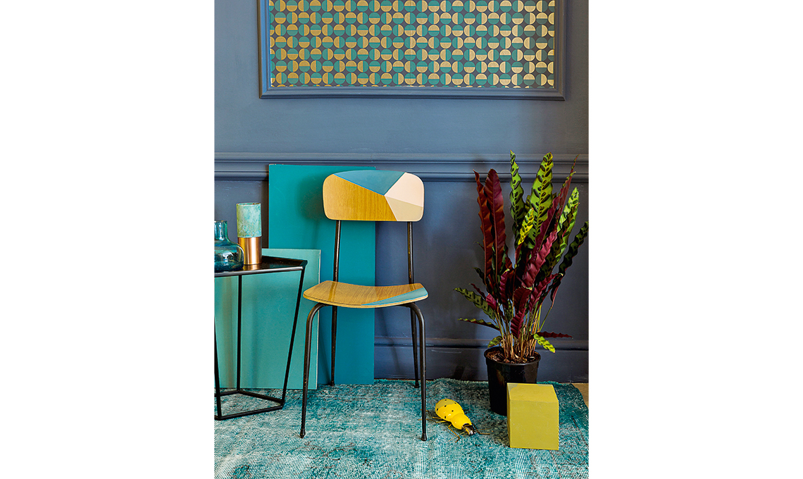 La classica sedia di formica da aula di scuola qui diventa tela d’artista grazie alla creatività delle stylist di CasaFacile. La decorazione punta tutto sulle campiture di colore e sulla scelta di una palette contemporanea che si abbina bene al color miele della sedia.