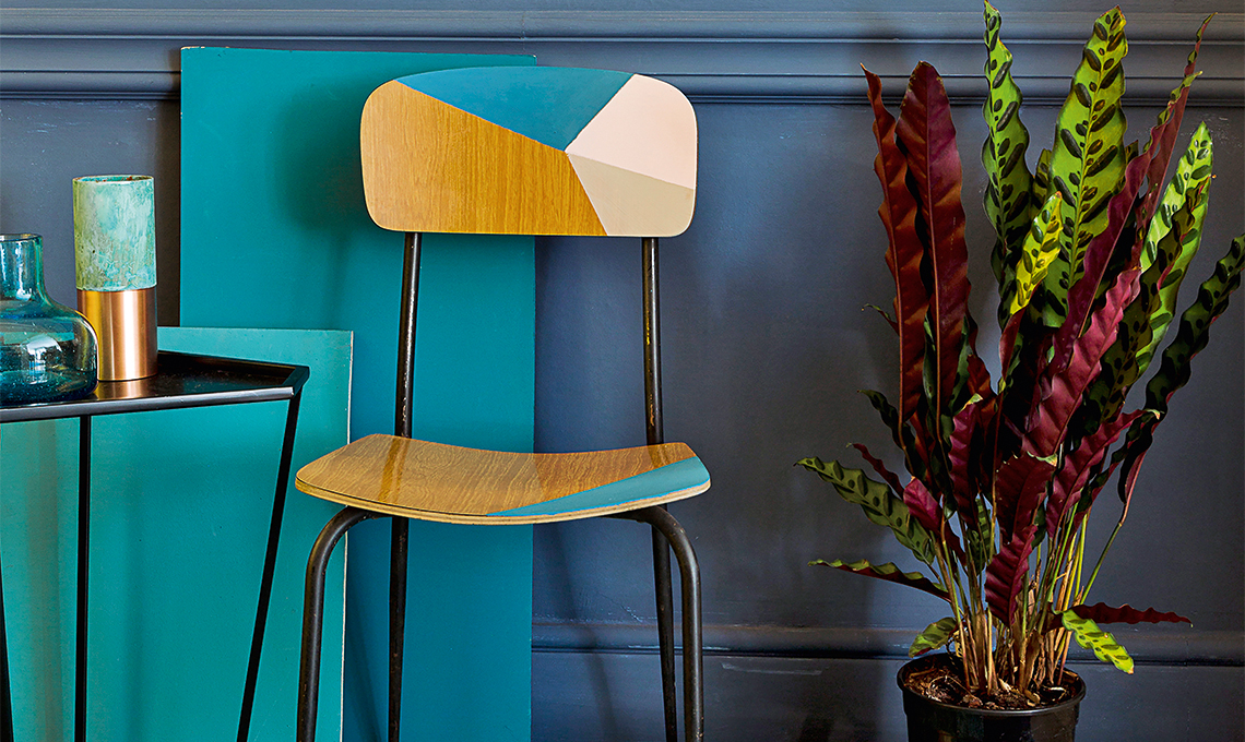 Una sedia vintage di quelle da scuola diventa un accessorio contemporaneo e di carattere grazie a un fai-da-te a base di colore