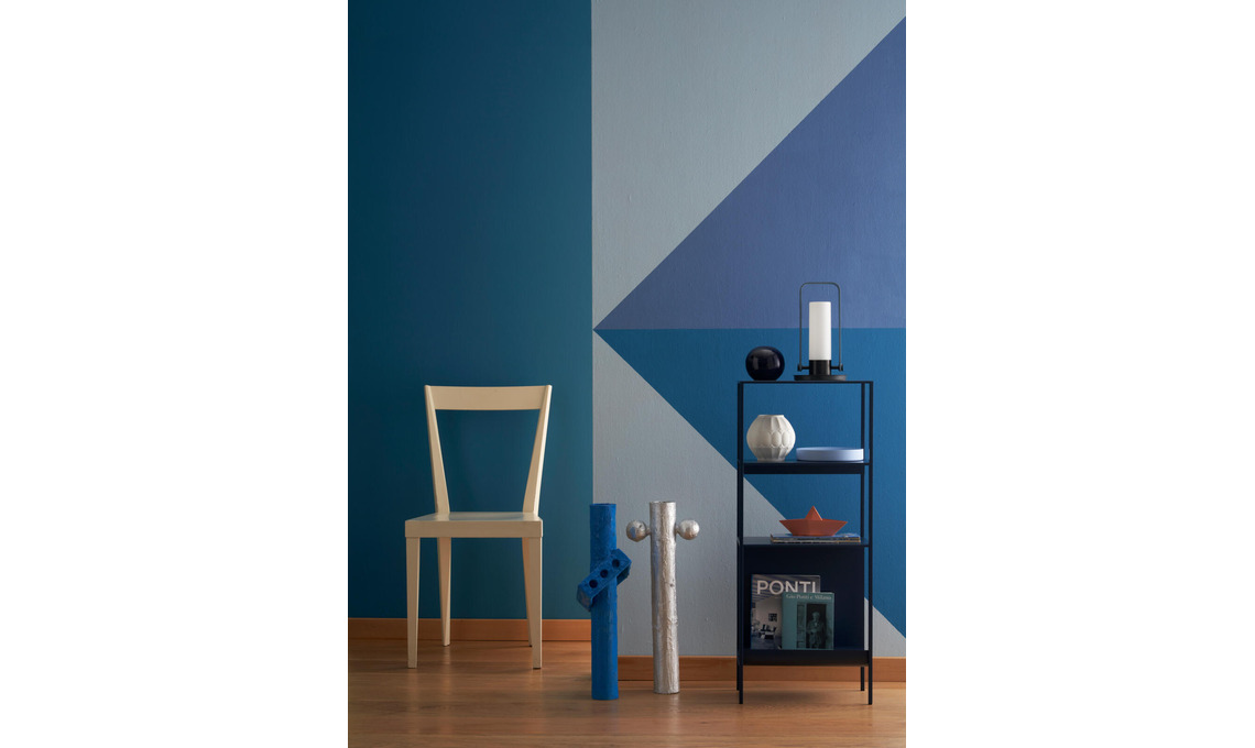 Azzurro ceruleo, indaco e blu mare sono le tinte della parete ‘geometrica’. Dai il colore più chiaro su tutta la superficie. Una volta asciutto fai i segni di riferimento per i tagli di colore poi realizza la mascheratura con il nastro adesivo viola – è più leggero e non stacca il colore di fondo. Dipingi, stacca il nastro, lascia asciugare e procedi con gli altri colori.
