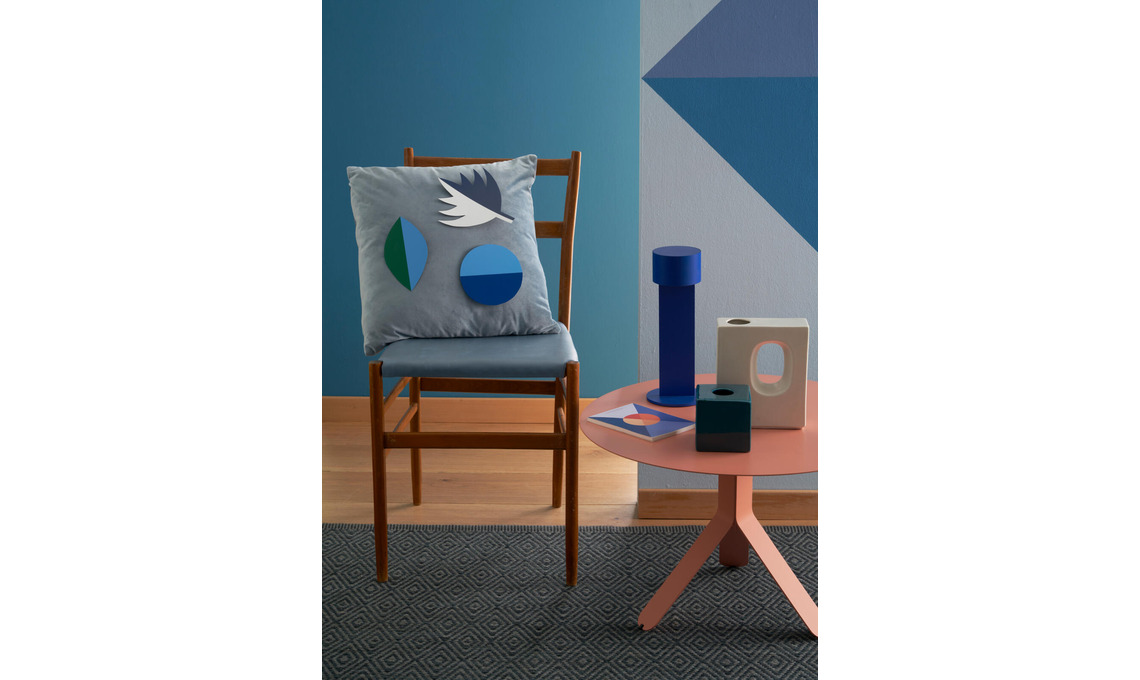 Sedia vintage [da Arcarreda]. Sul tavolino Yole terracotta [Hiro]: vasi vintage [Mauro Bolognesi] e lampada da tavolo Times di From Lighting [da Arcarreda]. Tappeto Goose Eye XL Icon Foggy Blue [Kasthall].