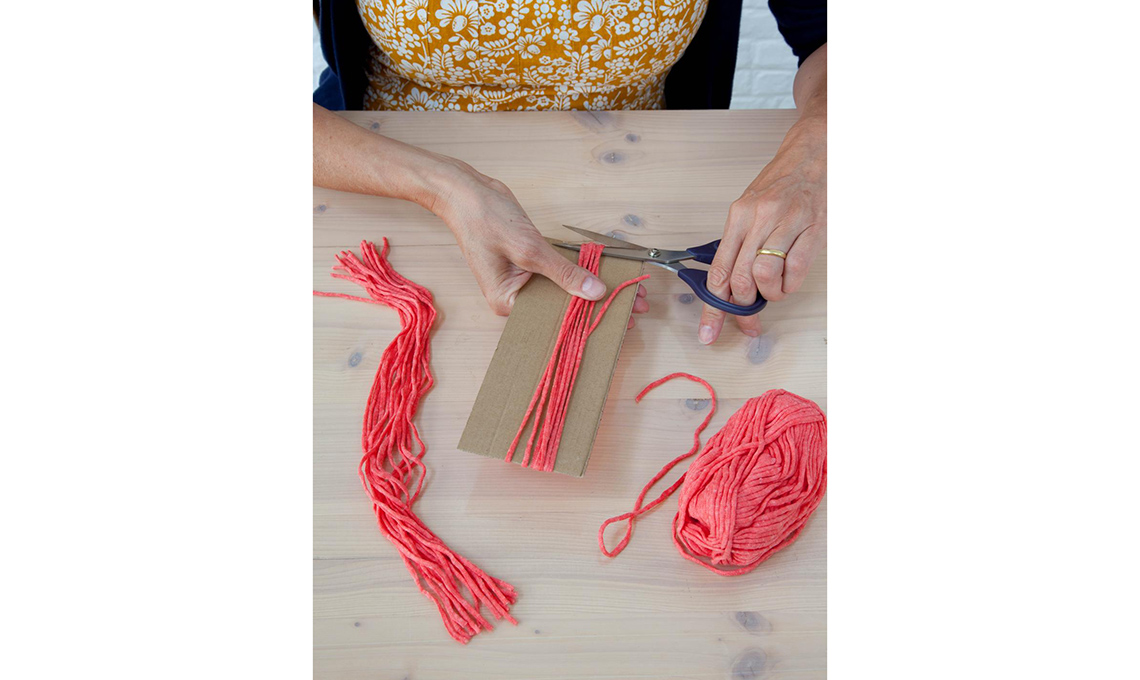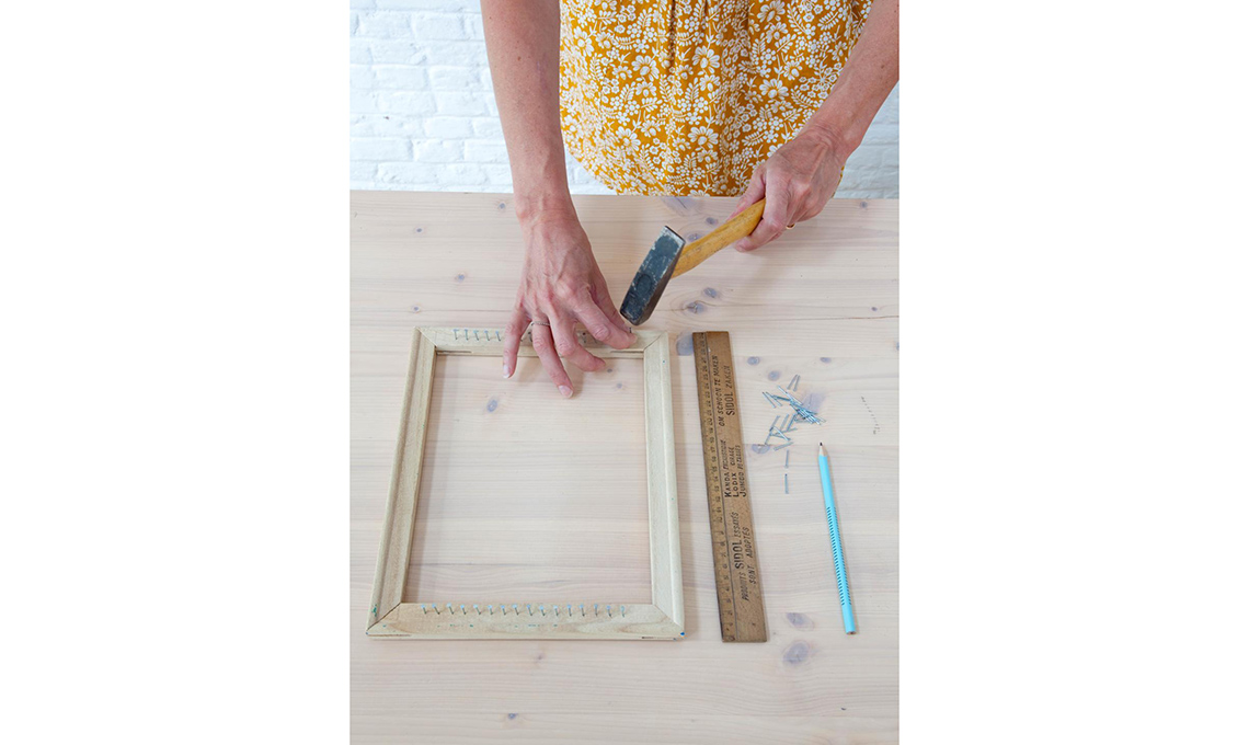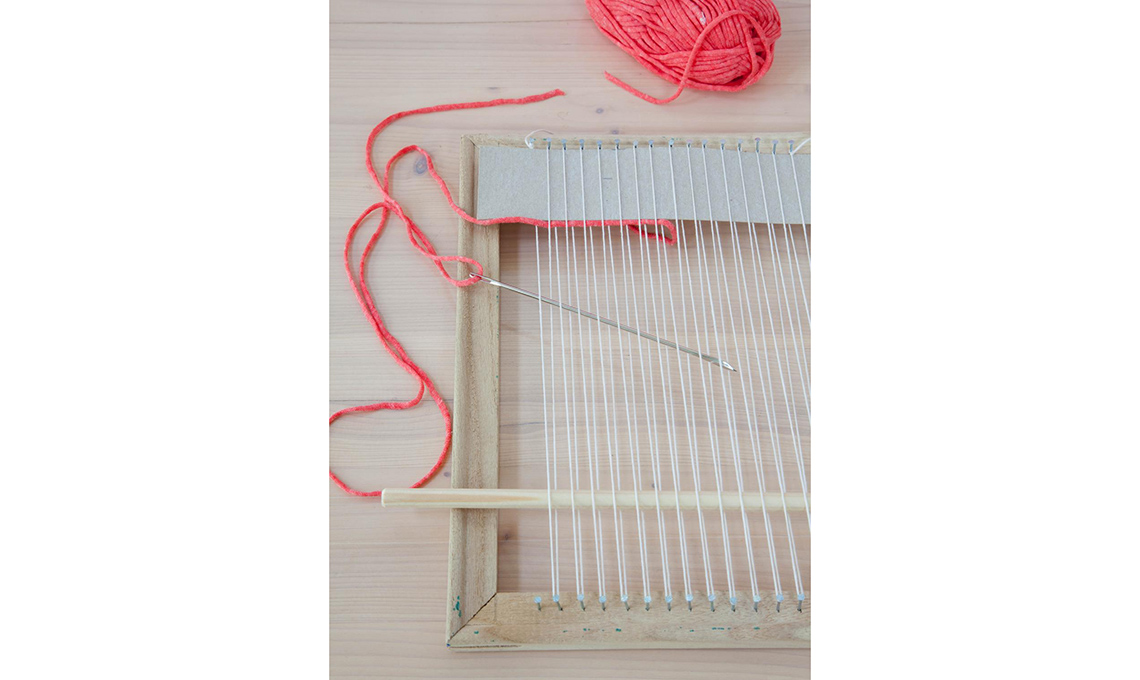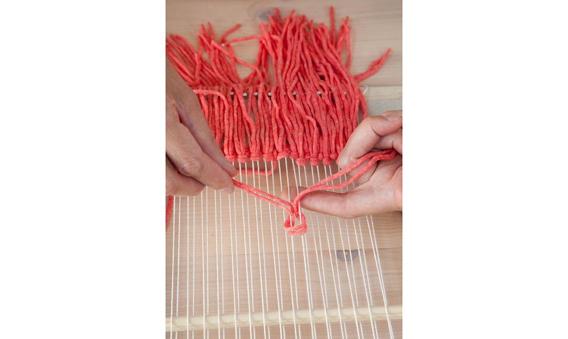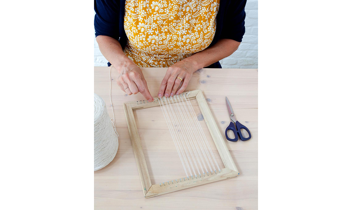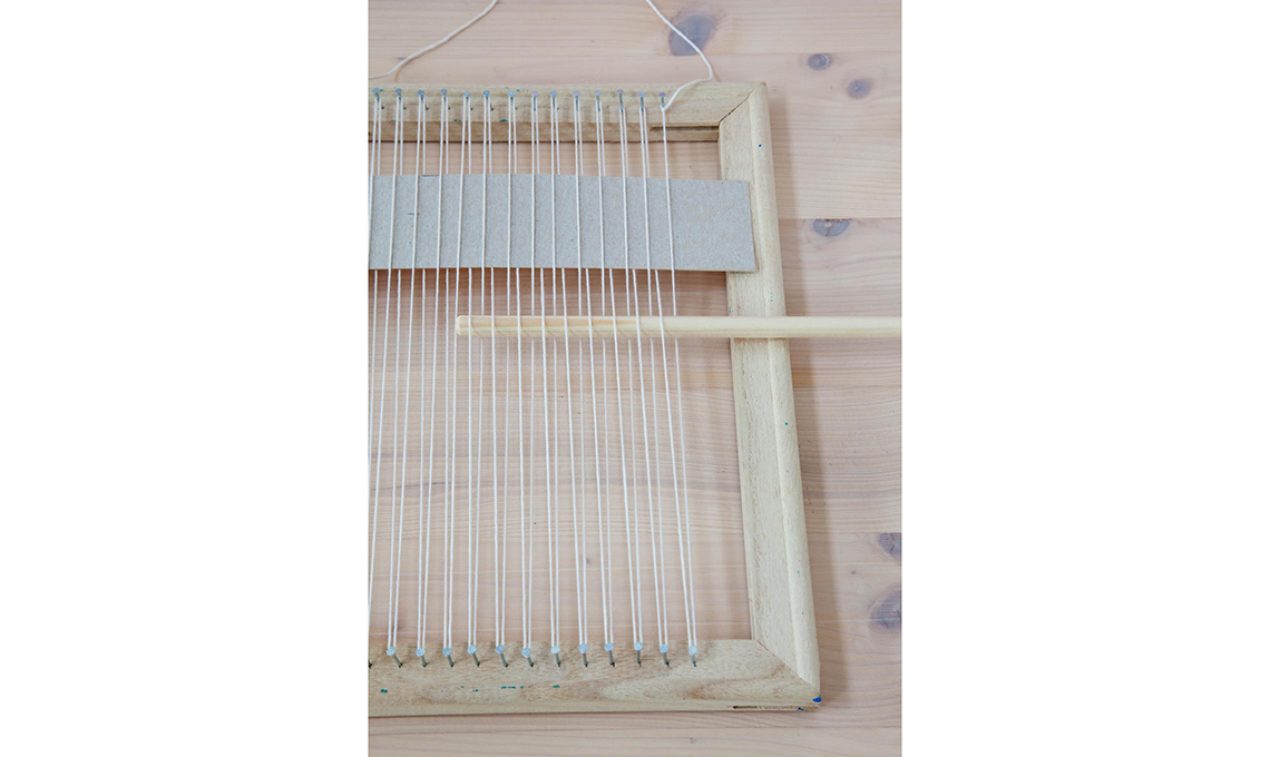 1. Annoda il filo di cotone ai pioli del telaio creando l’ordito per la tessitura.