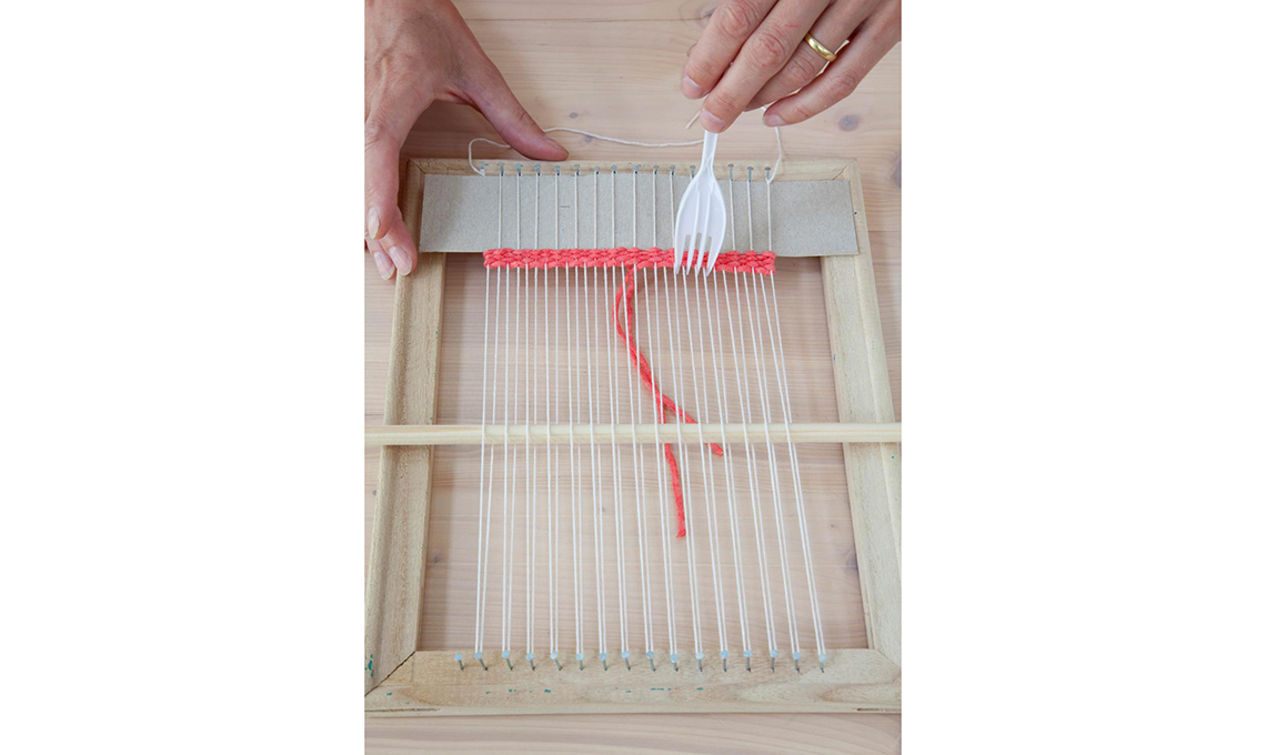 2. Aiutandoti con l’ago fai passare il filo di lana sopra/sotto i fili dell’ordito. Torna indietro realizzando l’intreccio sotto/sopra.