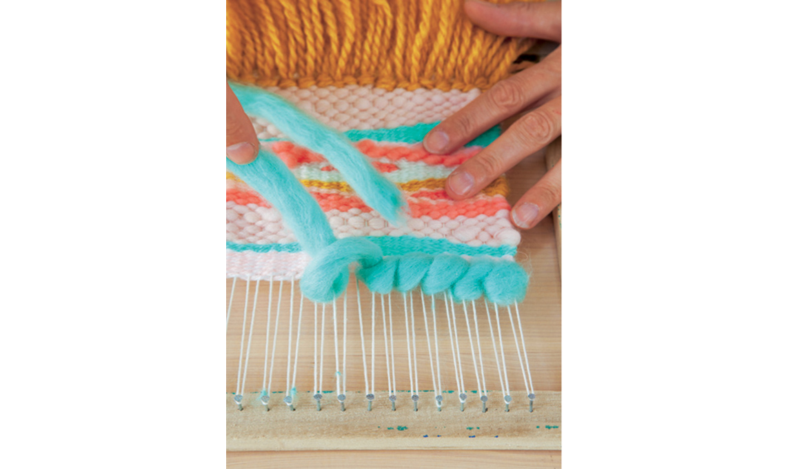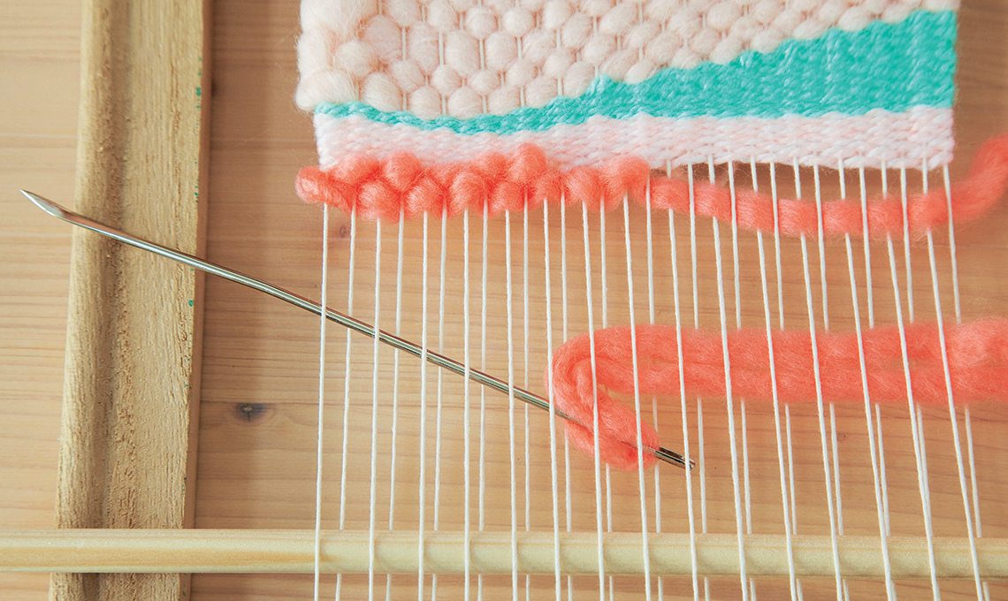Aiutandoti con l’ago fai passare il filo di lana sopra/sotto i fili dell’ordito. Torna indietro realizzando l’intreccio sotto/sopra.