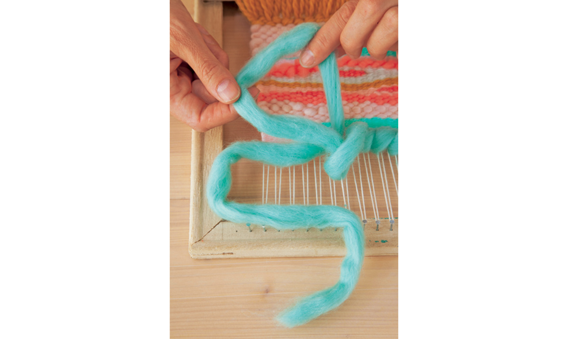 Intreccia i fili di lana più grossa con le dita, facendoli passare tra 2 fili alla volta. Per creare le frange fissa i fili con il nodo a bocca di lupo.