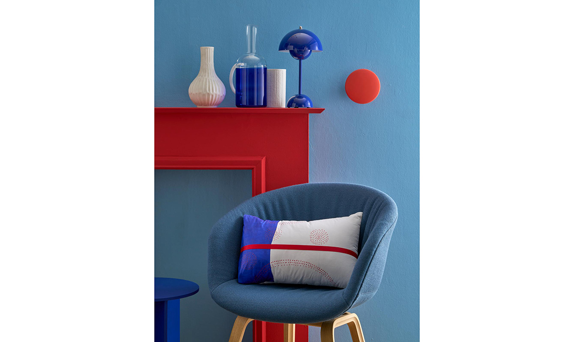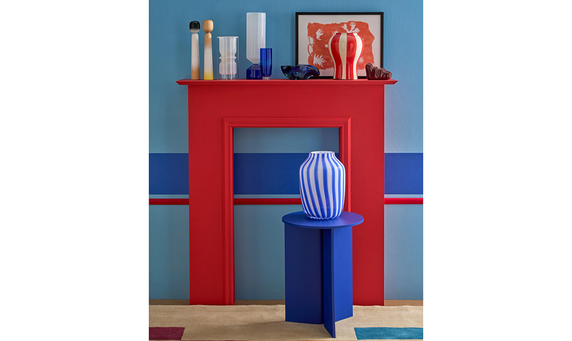 Lampada da tavolo portatile Flowerpot VP9 blu, tavolino Slit table blu e sedia About a Chair di Hay [da Design Republic]. Vasi vintage [Mauro Bolognesi]. Brocca Tequila Sunrise in vetro borosilicato trasparente e blu [Ichendorf], appendiabiti The Dots rosso [Muuto].