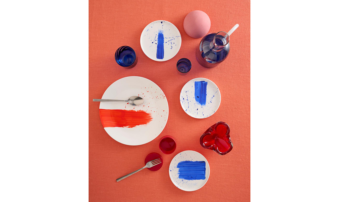 Con i colori per la ceramica a freddo [Porcelaine di Pébéo] e una pennellessa fai una strisciata di colore partendo dal bordo del piatto. Ispirandoti alla tecnica del dripping: intingi un pennello tondo nel colore e lascialo gocciolare in modo casuale. Per gli schizzi più piccoli usa uno spazzolino da denti e fai schizzare il colore passando un dito sulle setole. Lascia asciugare all'aria per 24 ore e metti i piatti in forno a 150 °C per 35 minuti.