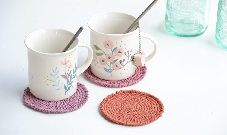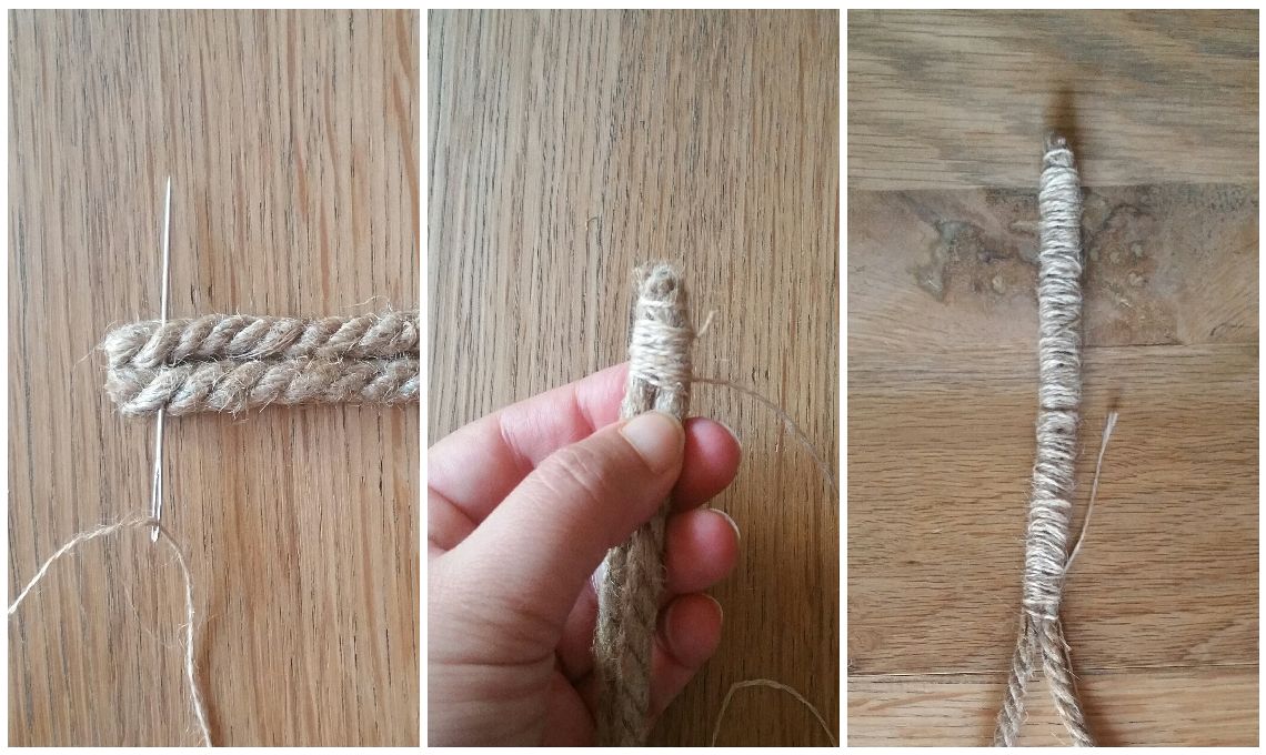 - Per i manici utilizzare due pezzi di corda di circa 70 cm ognuno, ripiegarli in due e unirli tra loro avvolgendoli con lo spago; infine fissare il filo e cucire le estremità dei manici internamente ai due cerchi in posizioni corrispondenti, cercando di nascondere i punti nella trama naturale della tovaglietta. L’impugnatura è pensata per portarla a mano ma se preferite una borsa a spalla basterà allungare i manici fino alla misura desiderata.