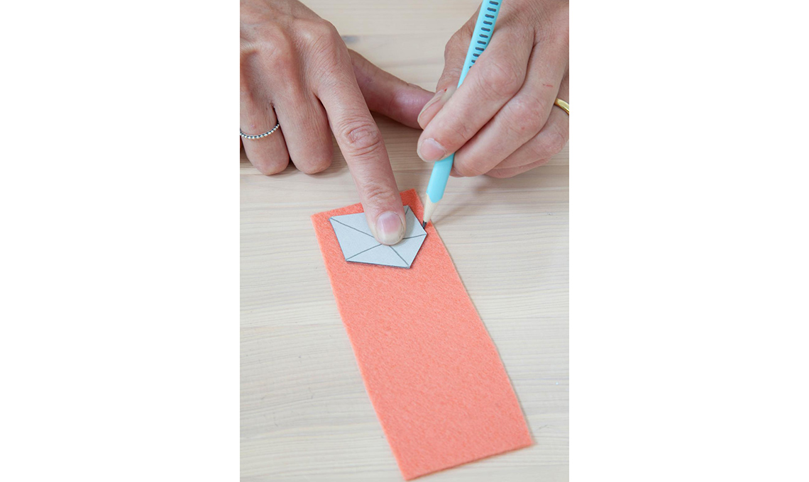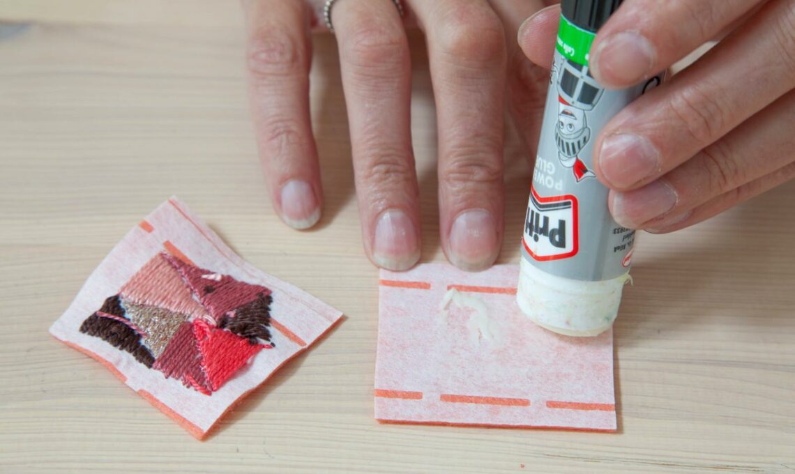 Risvolta e incolla sul retro della spilla il tessuto in più. Fissa con alcuni punti la base per la spilla.