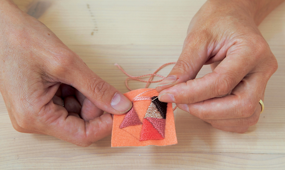 Con il cotone ricama il primo decoro a punto lanciato: fai uscire l’ago sul diritto, puntalo verso il basso sul lato opposto, quindi fallo uscire sul diritto, molto vicino al punto precedente.