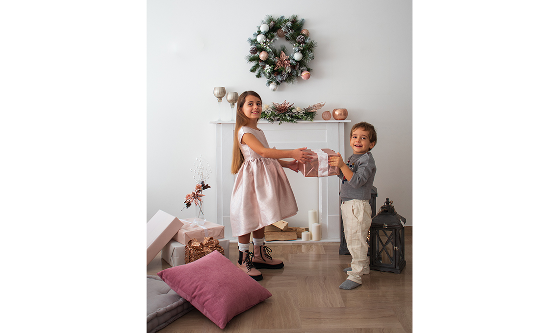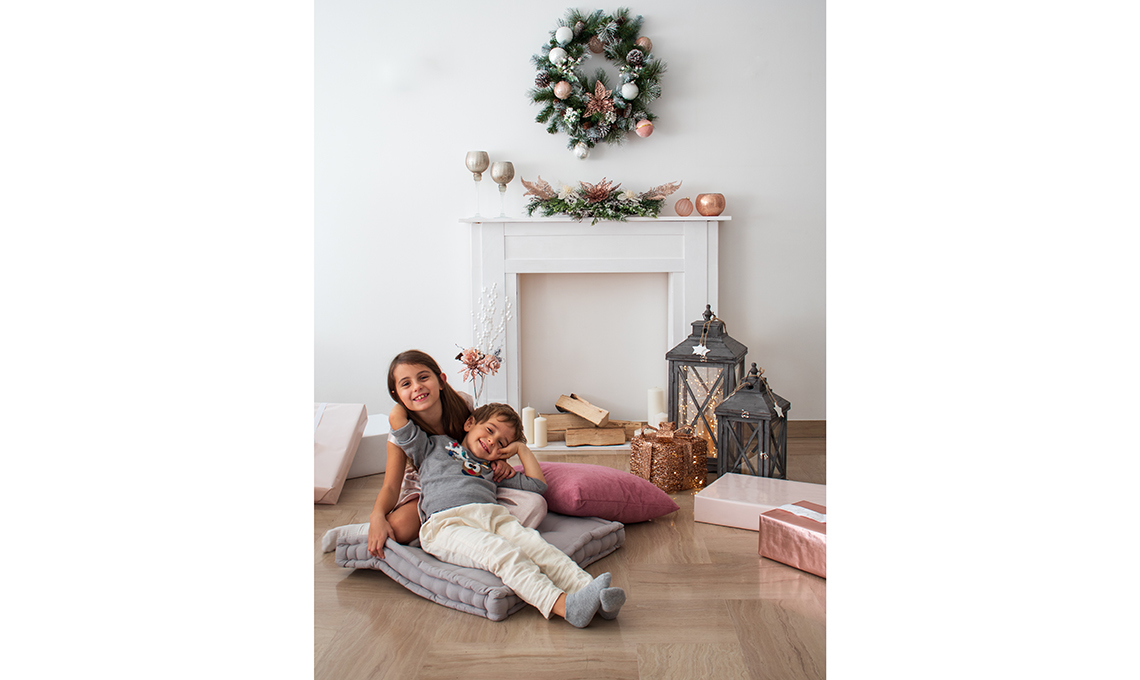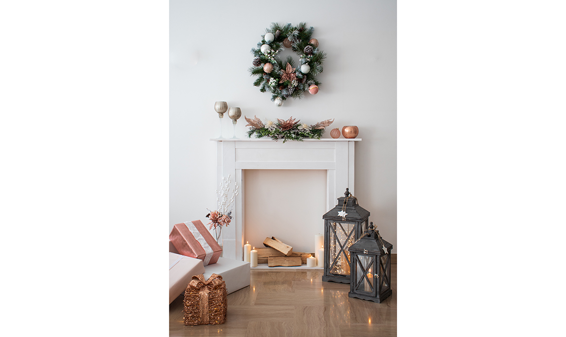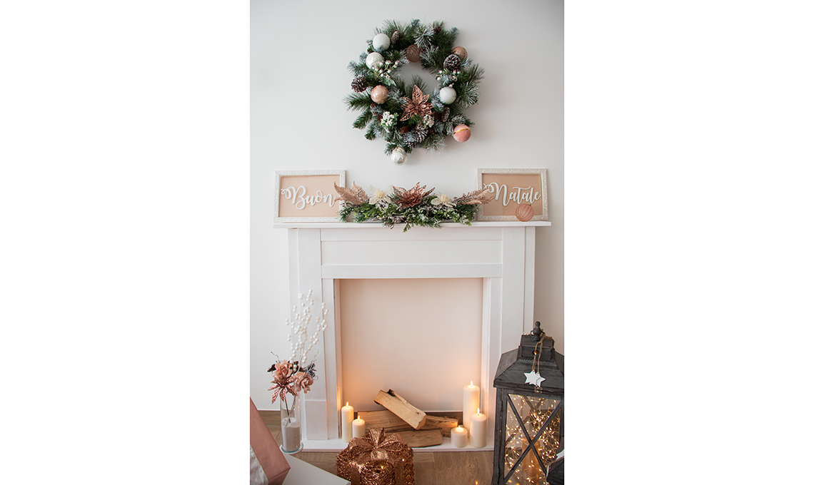 Puoi allestire l’interno della cornice, dove dovrebbe essere il caminetto, con dei tronchetti di legno, delle candele, delle pietre bianche. Per aggiungere un tocco natalizio