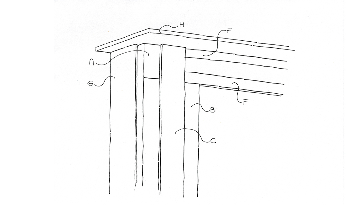 - Capovolgi sul retro la struttura e incolla gli elementi D sui 4 bordi degli elementi B. Incollare i listelli G sui montanti D.