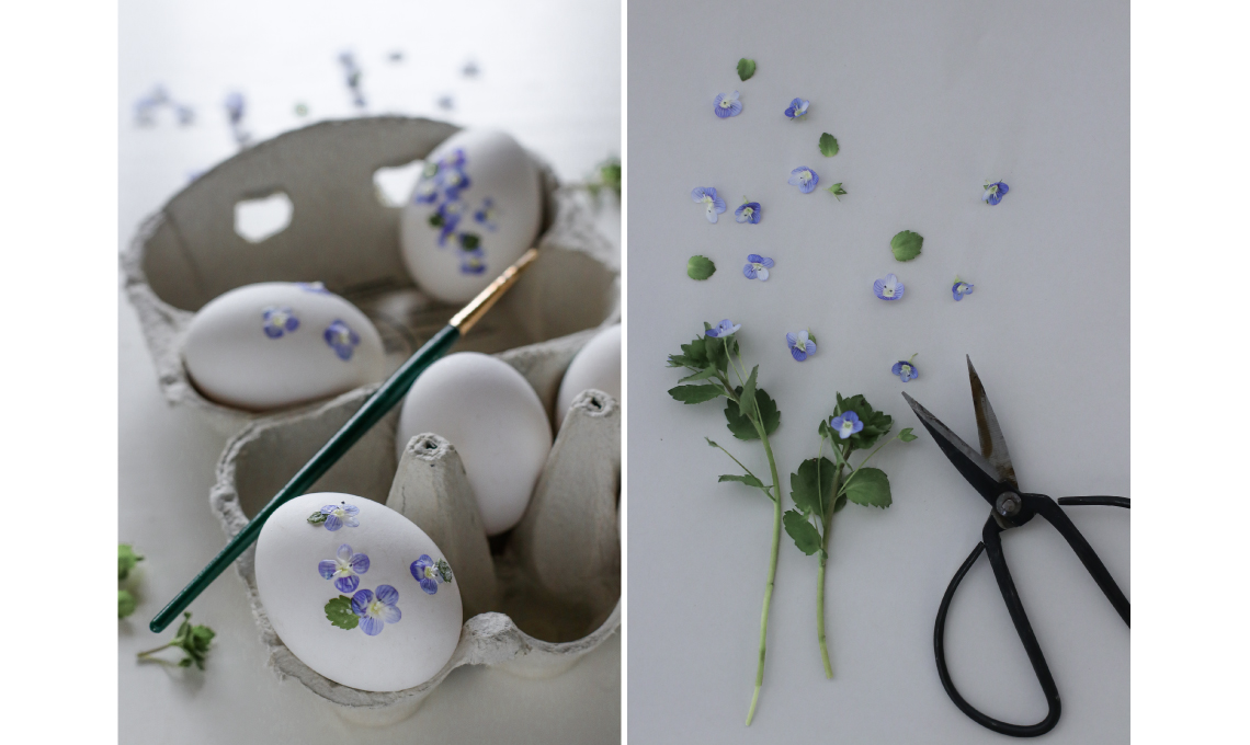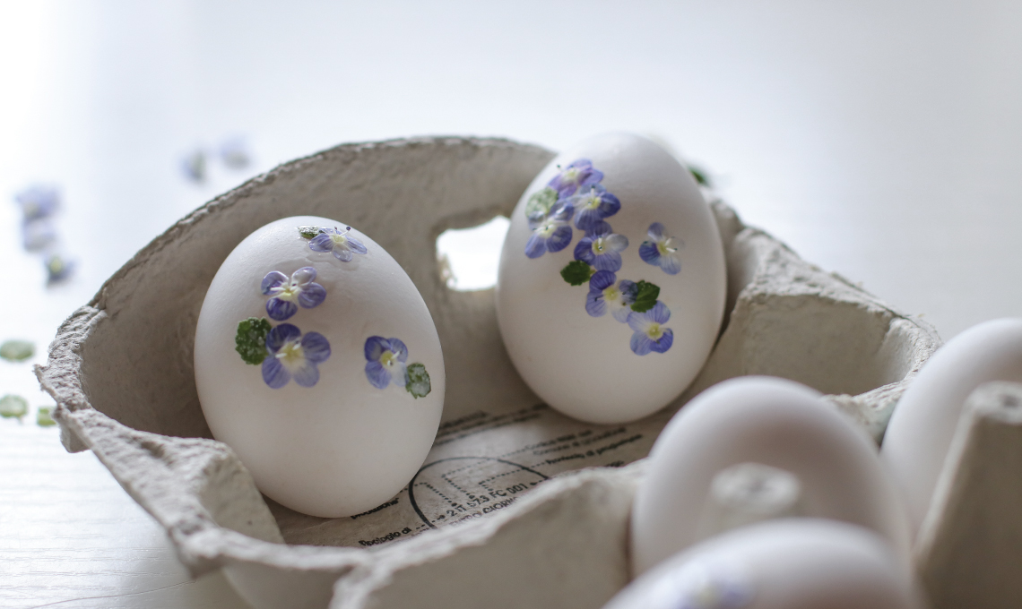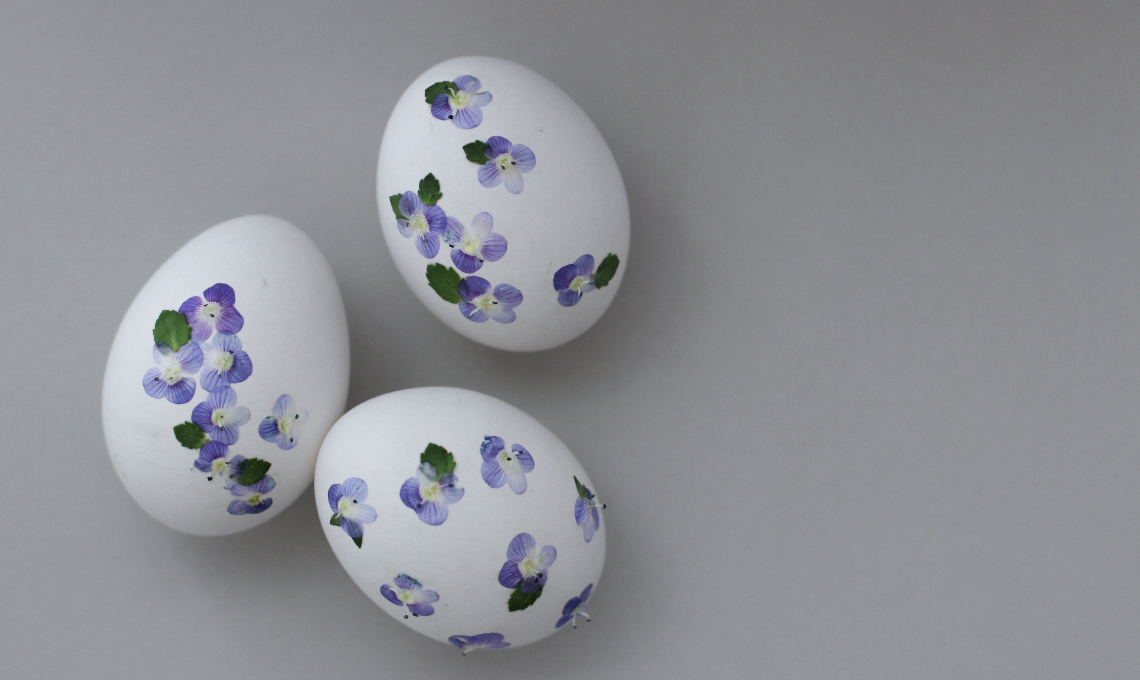 Ecco come rallegrare la tavola di Pasqua con le uova decorate con piccoli fiori freschi.