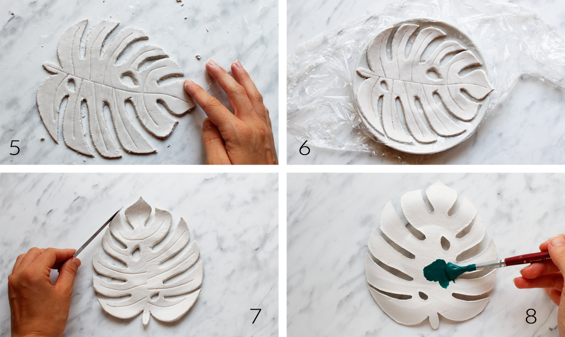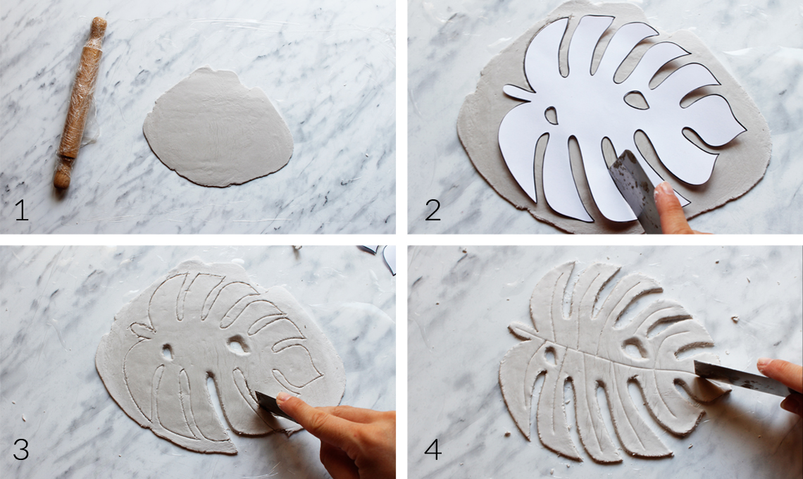 - Ritaglia la sagoma della foglia che avrai scaricato e stampato su un foglio A4, posala sul disco di pasta modellabile e usa la spatola per tracciare i contorni (foto 2)