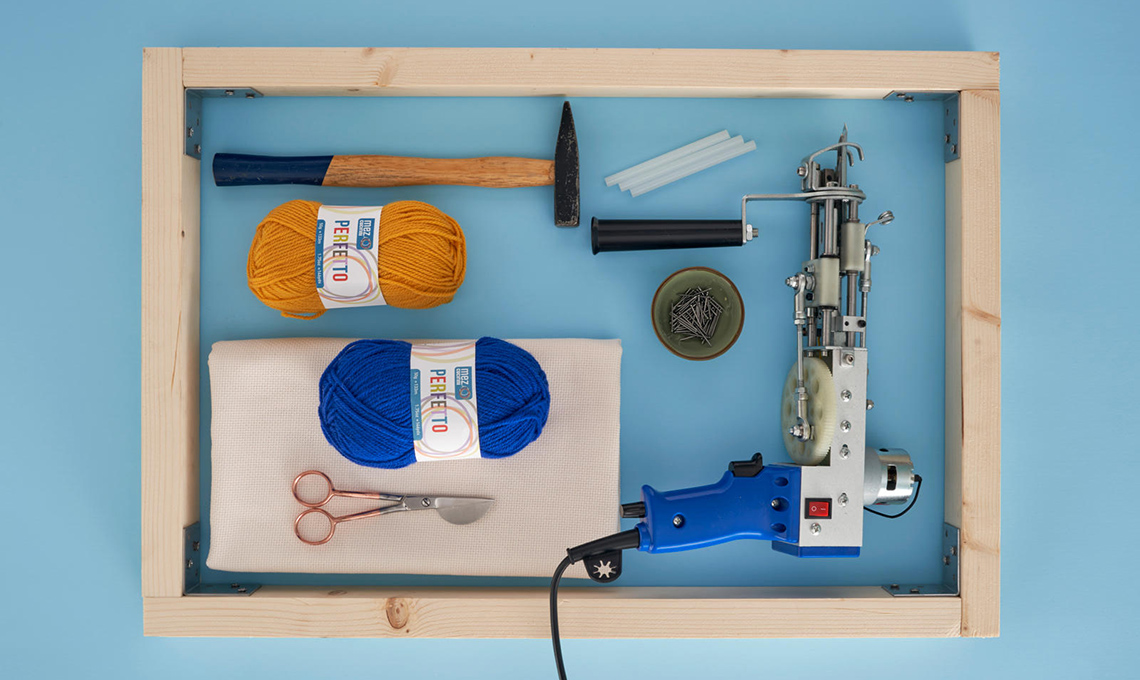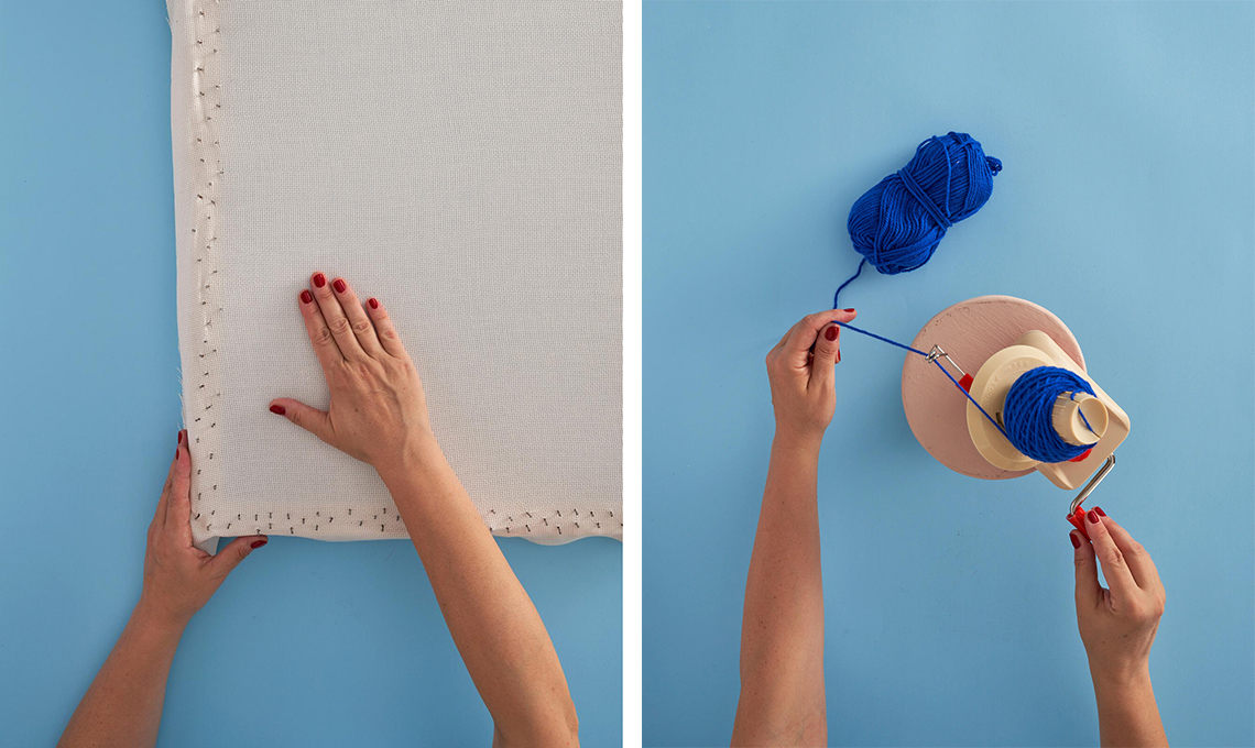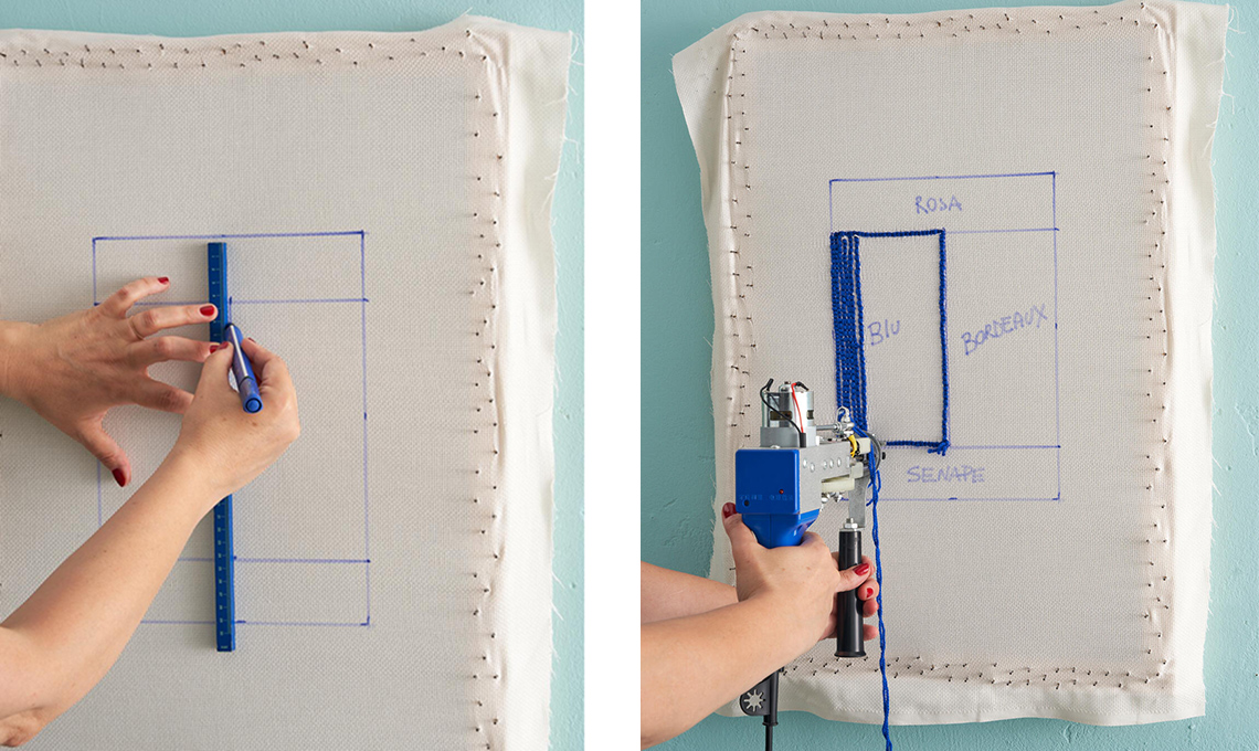 L'idea in più: realizza il tuo telaio fai-da-te. Puoi costruire il tuo telaio usando delle assi di legno quadrate, tagliate in misura con il seghetto e fissate all’interno con le squadrette di metallo. Lo spessore è necessario perché il telaio resti staccato dal muro quando si ricama con la pistola. Se vuoi realizzare un trittico di arazzi o più tappeti in contemporanea, costruisci un telaio grande che contenga i disegni dei diversi progetti, così da montare una sola tela.