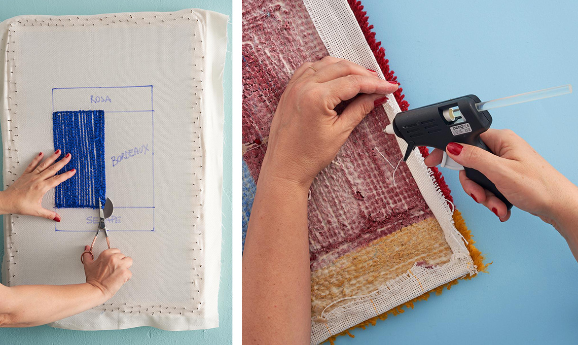 8. Finito l’arazzo, rimuovilo dal telaio, ripiega e fissa sul retro la tela in eccedenza, con la colla a caldo.
