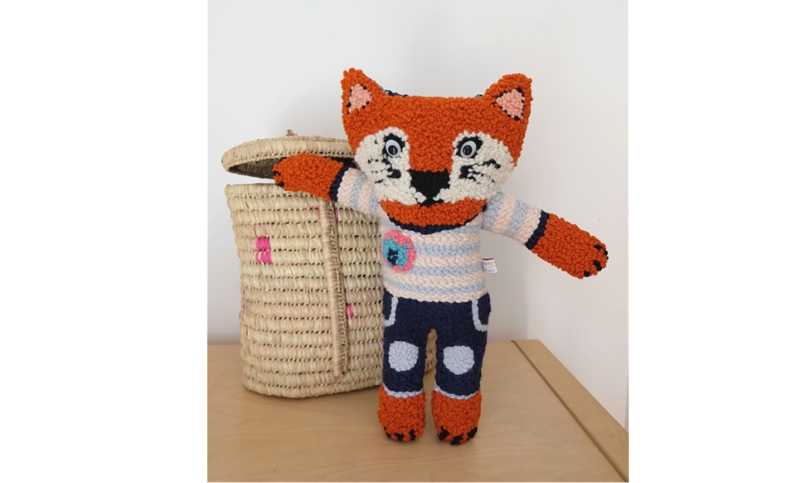 Volpe gioco per bambini, Chaumière Oiseau. Agnes è una designer tessile. Sul suo sito si possono acquistare prodotti finiti o pattern per cimentarti nella tecnica del punch needle.