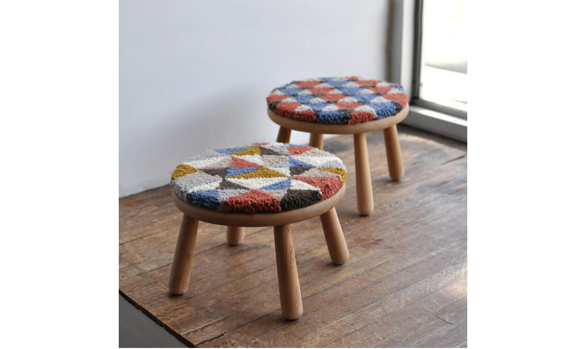Oxford Punch needle handbook, Bookhou, €39]. Con questo kit scoprirai come usare il punch needle e come realizzare semplici progetti come un copri sgabello dalla forma tonda.
