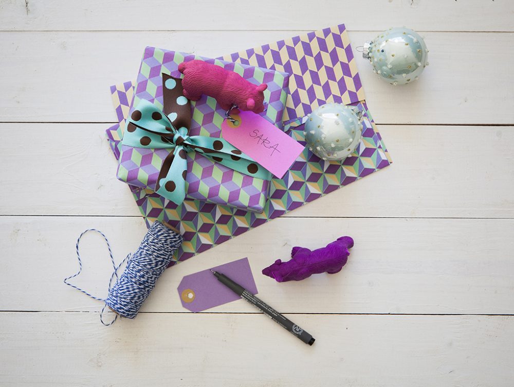 - Scegli carte da regalo o fogli da scrapbooking con micro fantasie fluo come pois, geometrie o stelle. Abbina il rosa tenue, il corallo, il fucsia e le tinte unite (a piccole dosi).