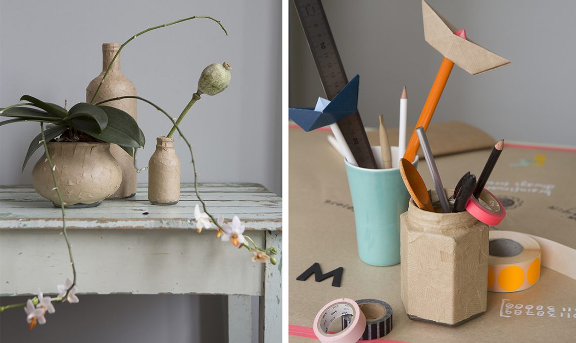 Nuova vita per i vasetti sbeccati: bastano alcuni ritagli di carta da pacchi e un po’ di colla vinilica per un effetto cartapesta