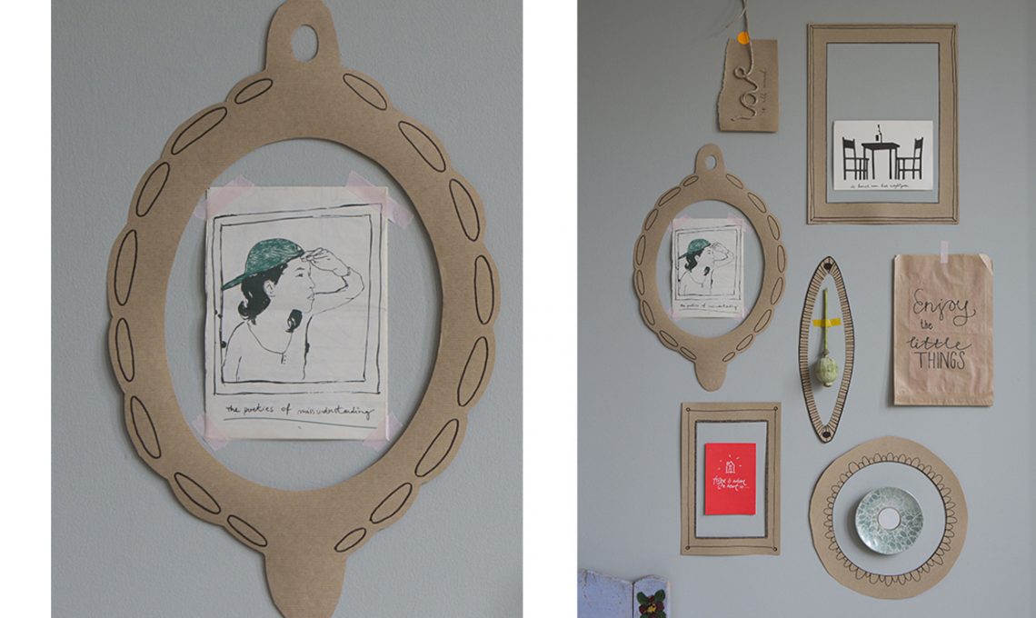 Le cornici più originali sono disegnate a mano libera e ritagliate dalla carta da pacchi. Una wall art ecologica per dare brio a una parete ancora vuota. All’interno schizzi, cartoline, ma anche ricordi di viaggio e piccoli memorabilia.