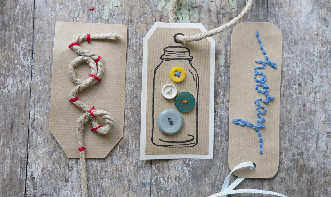 Ritaglia dal cartoncino bianco un’etichetta e dalla carta da pacchi un’etichetta gemella, leggermente più piccola. Incollale tra loro e disegna a mano libera, con il pennarello, la sagoma di un barattolo. Cuci i bottoni con i fili colorati. L’etichetta ok per i tuoi regali craft!
