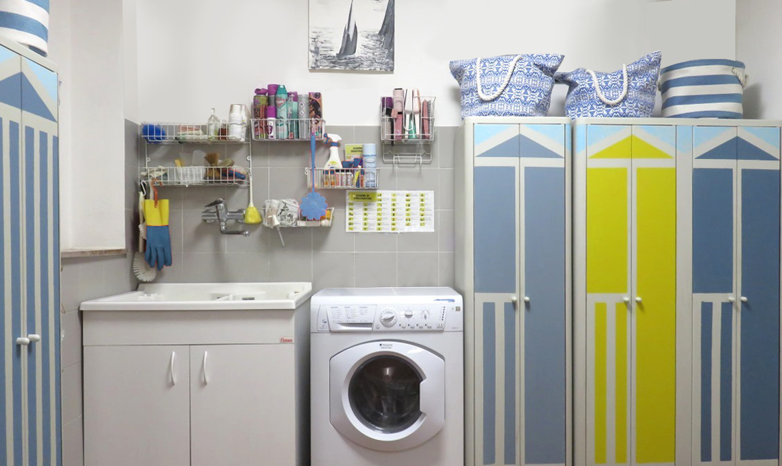 Quando ci siamo trasferiti, hanno trovato posto nella lavanderia, dove svolgono al meglio la funzione di contenitori di mille cose (a cominciare dalle attrezzature per il bricolage) ma l’ambiente, già piccolo e senza finestre, mi è sempre sembrato molto triste. Ho deciso di procedere con un semplice restyling per rallegrare l'ambiente che solitamente  uso anche come stireria.