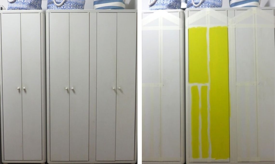 2. Ho riportato il disegno sui quattro armadietti e con il nastro carta ho protetto le parti che sarebbero dovute restare del colore originale.